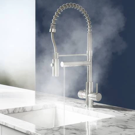 No more waiting around for the kettle to boil, just instant hot water with this boiling water tap, as and when you want it. The modern styling and natural character of this Madrid directional spray lever kitchen mixer tap will add a touch of sophistication to the kitchen. The tap also features a directional spout on a flexible hose, putting you in full control of the water’s direction, as well as a swivel tap that’s handy for cleaning bulkier items such as saucepans while the child safe spring lock on the instant hot handle prevents scalding.