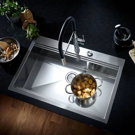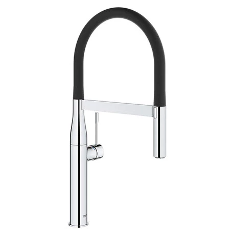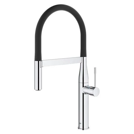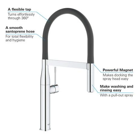 The Essence kitchen sink mixer is a stylish tap with a high swivel spout and features GROHE SilkMove technology for smooth handling of water flow and temperature. The flexible silicone hose makes using the spray head easier while the professional spray features two spray options – a normal spray and a powerful jet spray, ideal for cleaning veg, filling pots and even switching across a double sink. With the GROHE EasyDock M system, the spray head is easily guided back into place by a powerful magnet when you’re done. Manufactured using high grade materials and is finished with GROHE StarLight, a special chrome coating that is scratch resistant and easy to clean. All Grohe kitchen taps come with a 5 year guarantee.