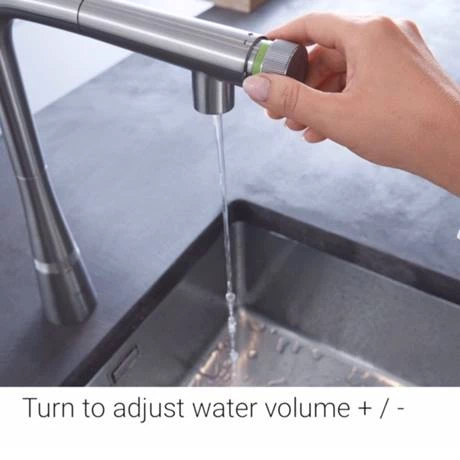 The Essence SmartControl kitchen mixer offers intuitive operation by pressing and turning. To start the water flow, simply push the on/off push button on the front of the spout, you can use your elbow or back of your hand, ideal for when your hands are full or dirty. Temperature is easily adjusted by turning the mixing valve located on the tap body. In addition, thanks to GROHE Magnetic Docking, the pull out spray head is gently returned to its original position by strong magnetic guidance after use.