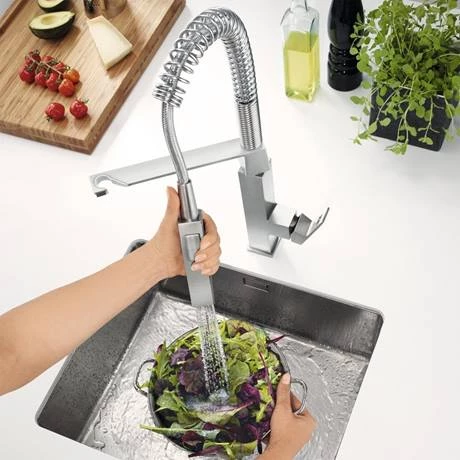 The Eurocube kitchen sink mixer is a stylish tap with a high swivel spout and features GROHE SilkMove technology for smooth handling of water flow and temperature. The professional spray features two spray options – a normal spray and a powerful jet spray, ideal for cleaning veg, filling pots and even switching across a double sink. This stylish tap is manufactured using high grade materials and comes in a matt SuperSteel finish. All Grohe kitchen taps come with a 5 year guarantee.