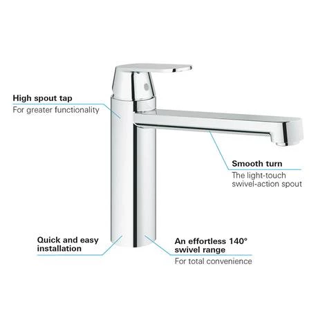 A modern kitchen tap with good design and functionality, the Eurosmart Cosmopolitan is the perfect choice. The tap features a GROHE SilkMove cartridge for smooth and effortless lever operation even after years of use. The 140° swivel spout range allows you to adjust the operating radius of the tap to the size of your basin without the spout hitting any surrounding cupboards. This stylish tap is manufactured using high grade materials and is finished with GROHE StarLight chrome coating that is scratch resistant and easy to clean. All Grohe kitchen taps come with a 5 year guarantee.