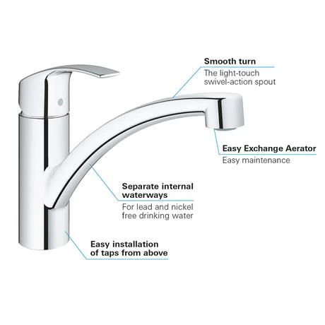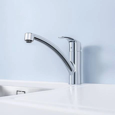 A modern kitchen tap with good design and functionality, the Eurosmart is the perfect choice. The tap features a GROHE SilkMove cartridge for smooth and effortless lever operation even after years of use; with GROHE Zero the water delivered by your tap will be lead and nickel free thanks to the separated inner waterways. The 140° swivel spout range allows you to adjust the operating radius of the tap to the size of your basin without the spout hitting any surrounding cupboards. This stylish tap is manufactured using high grade materials and is finished with GROHE StarLight chrome coating that is scratch resistant and easy to clean. All Grohe kitchen taps come with a 5 year guarantee.