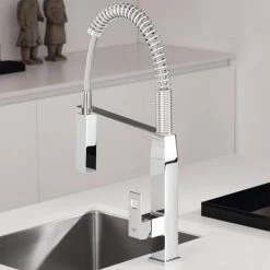 With high functionality and brilliant ease of use, the Grohe Get Professional Kitchen Sink Mixer offers restaurant-kitchen performance at home. The spout has a 360˚ swivel action which offers brilliant practicality and a spray feature giving you the choice of a powerful jet or a fine spray. When not in use, the EasyDock M integrated magnet allows you to stow the spray head effortlessly and neatly. The Easy Installation System and its flexible connection hoses mean fitting is quick and easy. The lustrous, long-lasting GROHE StarLight chrome finish means your kitchen tap will maintain its flawless looks through years of use.