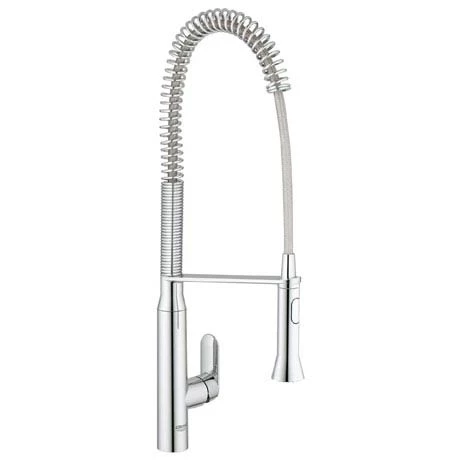 The K7 Kitchen Sink Mixer has been designed to provide professional-grade functionality. A sleek and striking design, the tap features a professional spray that swivels in a 360° radius, offering the choice of a fine spray jet and a powerful shower jet. The tap is manufactured from high grade stainless steel and comes finished in GROHE StarLight® chrome coating, an ultra smooth finish that is scratch resistant and easy to clean.