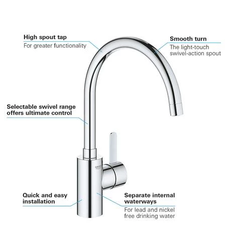 The Grohe Eurosmart Cosmopolitan Sink Mixer features the level of style and functionality you’d expect from the best kitchen taps. It comes with a high spout that swivels in a 360° range for easy handling. This Grohe kitchen tap is equipped with the equally robust GROHE StarLight® coating and is extremely easy to use, thanks to the GROHE SilkMove® technology, which allows you to smoothly and accurately set the water volume and temperature.