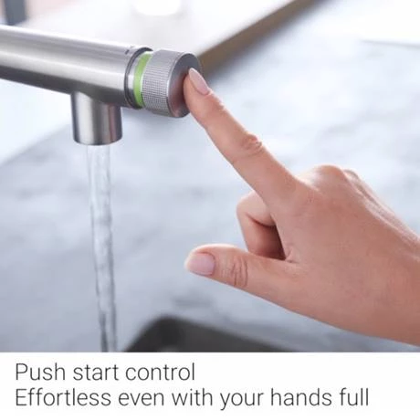 The Minta SmartControl kitchen mixer offers intuitive operation by pressing and turning. To start the water flow, simply push the on/off push button on the front of the spout, you can use your elbow or back of your hand, ideal for when your hands are full or dirty. Temperature is easily adjusted by turning the mixing valve located on the tap body. In addition, thanks to GROHE Magnetic Docking, the pull out spray head is gently returned to its original position by strong magnetic guidance after use.