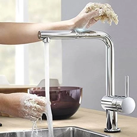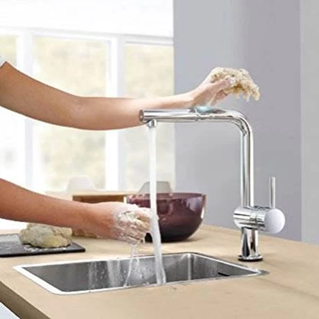 An innovative design from Grohe, the Minta Touch simply turns on and off from a touch with your wrist, elbow or fingertip so the tap stays clean even when your hands are covered in dough, paint or other residue. While the EasyTouch technology means you never need to leave dirty finger marks on your kitchen tap again, the sparkling StarLight chrome finish ensures your tap will always look like new. Its high neck spout makes it ideal for filling tall pans and the pull-out spray makes rinsing quick and easy. The Minta Touch will sit perfectly in any contemporary kitchen.