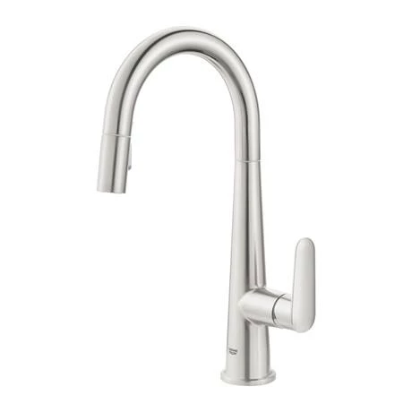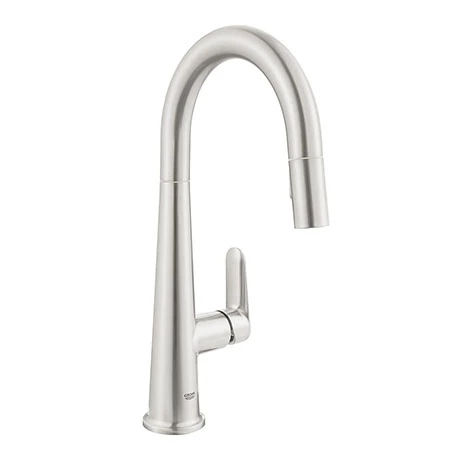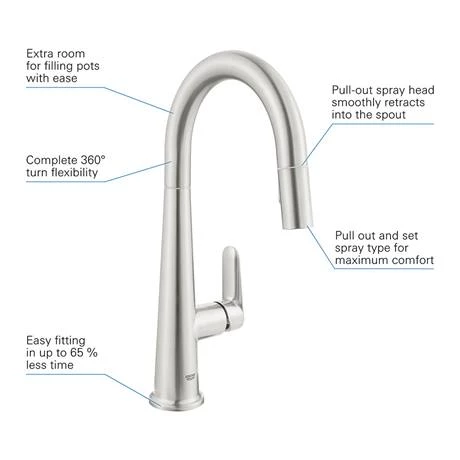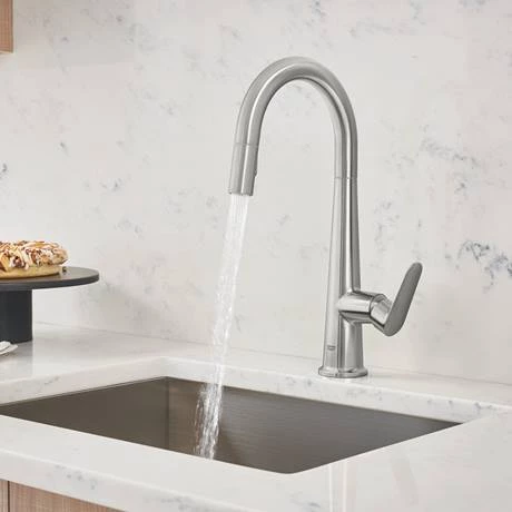 Bring design flair and operating power to your kitchen with the Grohe Veletto kitchen sink mixer with a 2-spray pull-out comfort shower head. The high C-shaped spout leaves plenty of room for filling large pots or vases, and the spout swivels smoothly through 360° for added flexibility. The pull-out comfort shower head is perfect for rinsing the sink or prepping vegetables and offers 2 different spray types – a laminar spray and a powerful jet spray. GROHE EasyDock ensures that the shower head is drawn easily back into place. Installation is tool and hassle free thanks to the GROHE QuickFix Plus installation system.