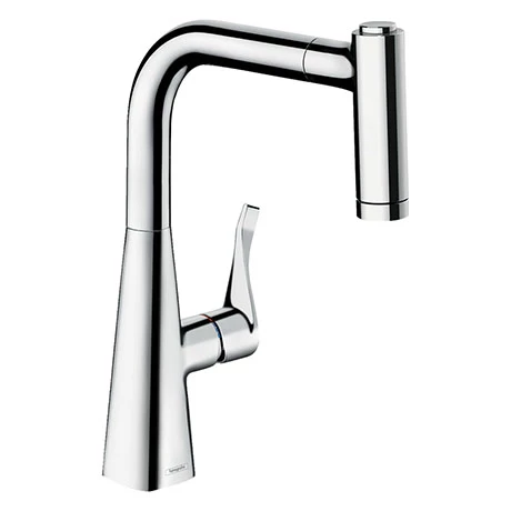 hansgrohe kitchen taps use water more efficiently and add a stylish highlight to any kitchen. The Metris M71 comes elegantly finished in scratch-resistant classic chrome, it features an ergonomic flat single lever symbolising the synthesis of sophisticated design with clever functionality. The QuickClean rub clean aerator loosens any limescale deposits making sure your tap looks beautiful, and stays working for longer.