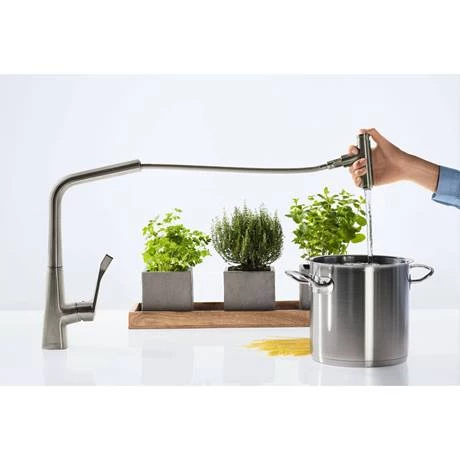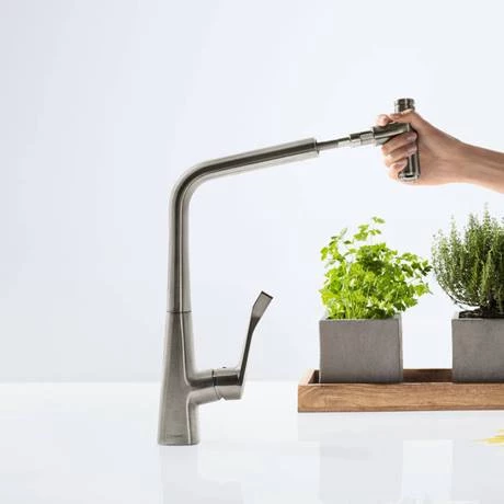 hansgrohe kitchen taps use water more efficiently and add a stylish highlight to any kitchen. The Metris M71 comes elegantly finished in scratch-resistant stainless steel finish. It features an intuitive Select button for maximum convenience – also saving on water consumption by encouraging the user to turn the mixer off when it isn’t needed. The swivel spout can be adjusted in 2 positions and comes in very handy when working to the right or left of the mixer while the pull out spray is perfect for rinsing and preparing food.
